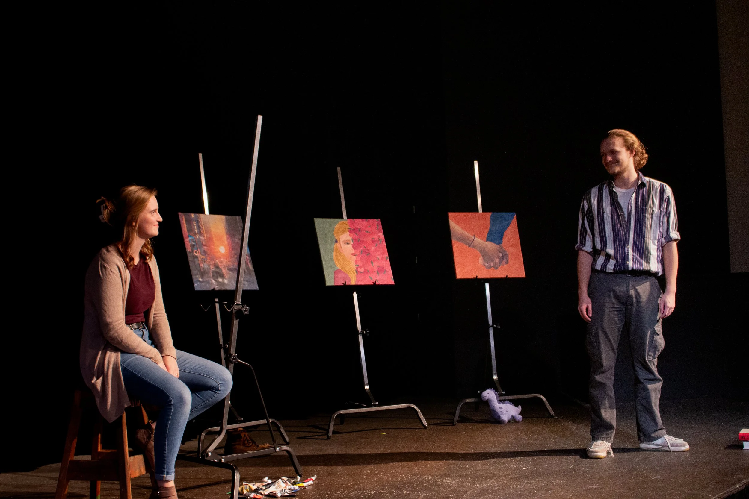 His transformation is reflected in the simple setting of the play. As Atlas’ character grows and grieves, he creates six paintings, which are placed on six easels on the stage where Atlas sits in the middle. These paintings tell the story of his life from his childhood to his marriage and family to his tragic loss. The final painting is of two intertwined hands, painted as Atlas finally realizes that, even in the midst of death, he is still held.